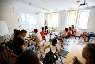 Просторное помещение с гибкой рассадкой и дополнительным уровнем с мягкими подушечками. Такое пространство одинаково подойдет для официальных и неформальных мероприятий, презентаций, митапов, обучающих курсов и семинаров.